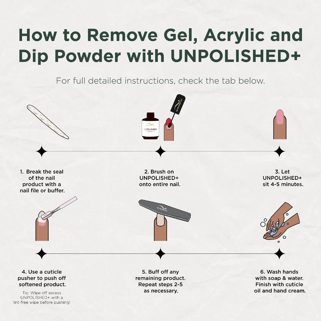 Introducing UNPOLISHED+, the acetone-free solution for quicker and easier nail product removal. Our water-based formula swiftly softens and dissolves gel, acrylics, and dip powder in minutes. Elevate your nail care routine with UNPOLISHED+, where efficiency meets an advanced formula, ensuring a clean slate every time: